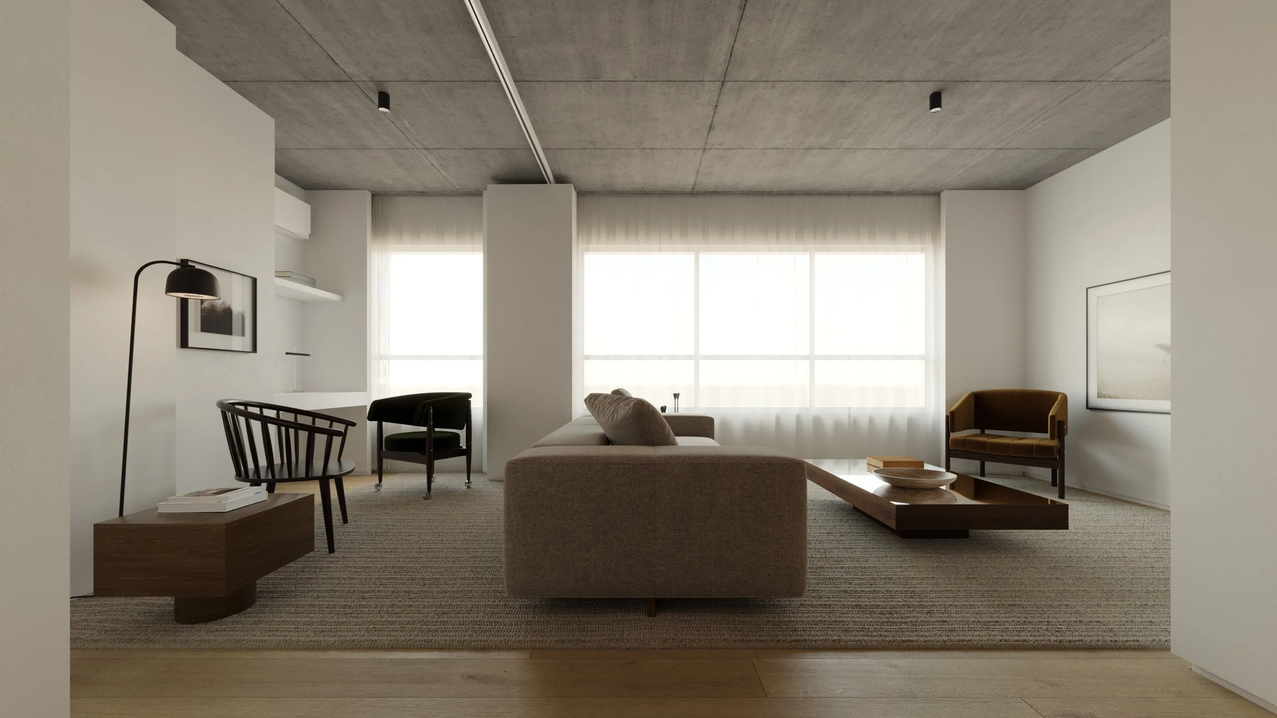 A luz, filtrada por cortinas translúcidas, desenha o tempo dentro do apartamento. Ela não é apenas iluminação, mas matéria que transforma — revelando texturas, criando sombras, marcando o ritmo da casa. O projeto não busca controlar o espaço, mas permitir que ele se transforme com o uso, com o silêncio, com a presença.